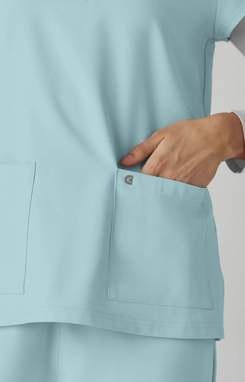 Style meets substance in this modern, split-neck scrub top designed to keep you looking sharp and feeling confident all day. This flattering silhouette features a soft rib-knit collar and raglan sleeves for a touch of sporty ease. Functional details like an ID badge loop at the shoulder, two roomy patch pockets, and side slits make it perfect for life on the move. Pair it with the matching Saylor pant.