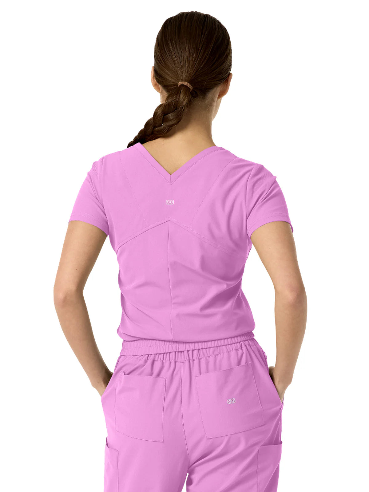 Experience all-day comfort and a polished look with the CELINE Kinetic V-Neck Scrub Top. Crafted from a premium, breathable, and moisture-wicking polyester knit, this top features a unique elastic tuck band waist that stays securely in place, giving you the appearance of a tucked-in shirt without the hassle. Designed with an athletic fit that runs true to size, the CELINE top also includes a signature V-shaped back neck, two convenient chest pockets, and reinforced bartacks at stress points. The angled back yoke and center back seam ensure a superior fit, while the easy-care fabric makes maintenance a breeze. Center Back Length: 24.25"
